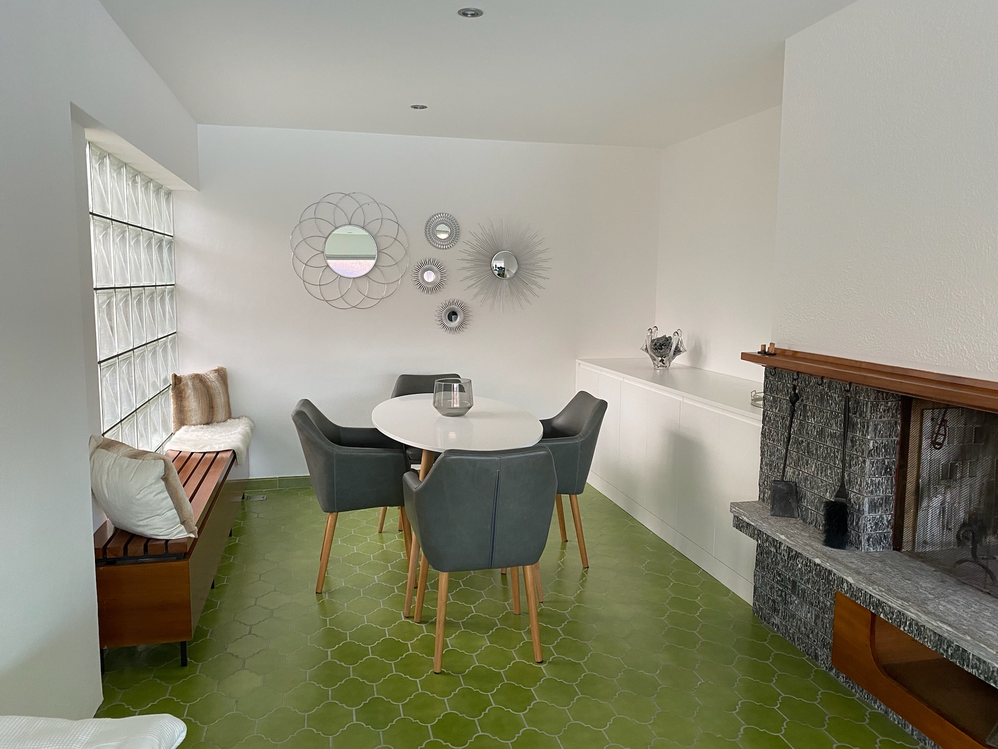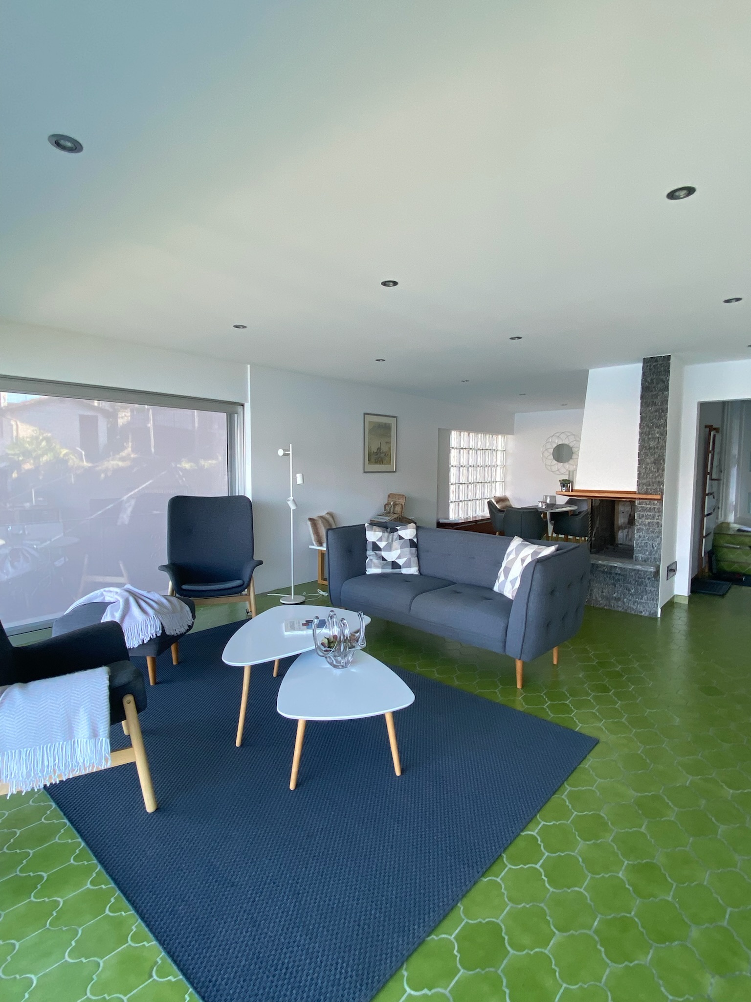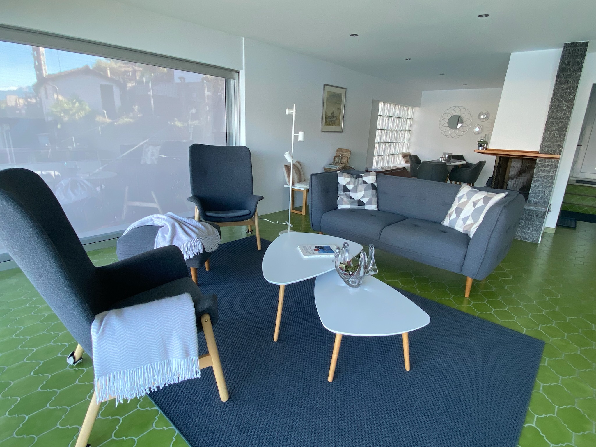 Das großzügige Wohnzimmer im 70s Style verfügt über Panoramaschiebefenster, sodass sich das Zimmer zur Seeseite komplett öffnen lässt und eine beeindruckende Aussicht auf den Lago Maggiore bietet. Eine offene Essecke im Raum bietet Platz für gemeinsame Mahlzeiten mit Seeblick. Der offene Kamin sorgt für eine gemütliche Atmosphäre auch an kühleren Abenden.